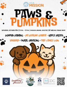 MISSION, TEXAS – The City of Mission is excited to invite the community to join us for a festive and family-friendly event, Paws & Pumpkins, happening on Saturday, October 18, 2025, from 6:00 to 8:00 p.m. at the Mission Animal Shelter, 227 Abelino Farias Street.