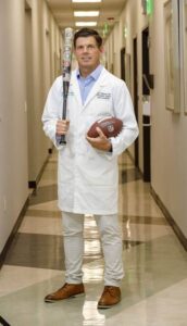A: I am originally from north Texas and began my academic journey at Texas A&M University, where I earned my Bachelor of Science in Biomedical Science. I then attended Texas A&M University College of Medicine during which I joined the US Navy. Afterward, I was commissioned as a Lieutenant in the U.S. Navy and completed my internship at the Naval Medical Center San Diego. I later served as a Naval Flight Surgeon, caring for Marine Corps recruits and aviators before completing my orthopedic surgery residency at the University of Alabama at Birmingham. I completed my training with a Orthopedic Sports Medicine Fellowship at Houston Methodist in Houston, Texas.