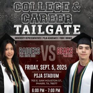 Pharr- Pharr-San Juan-Alamo ISD will be hosting its 3rd Annual PSJA College & Career Tailgate at the PSJA North ECHS Raiders vs PSJA ECHS Bears football game happening on Friday, September 5, 2025, from 6:00 PM – 7:00 PM on the south side of the PSJA Stadium.
